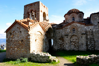 So, these are a lot of pictures. I'm sorry, but I didn't want to leave anything out! The archeological site at Mystras is the ruins of a city (churches, a castle and all) sitting at the edge of Sparta amongst the mountains. The focus of the site is the remains of the Byzantine style churches which has been restored inside and out. True to style, the red tile octagonal ad hexagonal roofs stand out in the scenery of the Peloponesse. The churches open up into large domed ceilings filled with colorful frescoes depicting images of Christ. The integration of thinly sliced brick mixed up between the stone was a playful surprise for the eye.